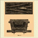 Среднюю ее часть, как и в предыдущем примере, занимает чугунная изложница a, в которую отливается средняя (рабочая) часть валка; шейки его отливаются в песчаные формы, оттиснутые в опоках b и c; d — литник, сообщаемый с внутренностью формы горизонтальным каналом e. На фиг. 4 изображены: вверху — чугунная железнодорожная крестовина C, а внизу форма, служащая для отливки этой крестовины.