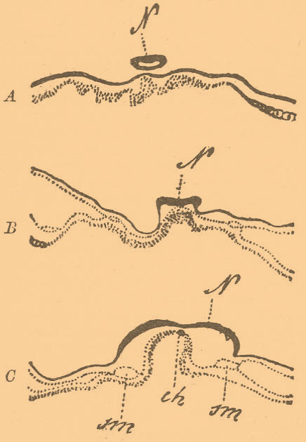 Фиг. 2. Три поперечных разреза через зародыш цыпленка, развившегося в яйце, в котором убавлена была часть белка. А — через переднюю, В — через среднюю, С — через заднюю часть. N — нервный зачаток; ch — хорда; sm — сомиты (по Шимкевичу).