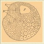На эти-то формы и опираются Ру и Вейсман (см. Наследственность). По их представлению, каждое деление ядра и яйцевой клетки, несмотря на видимое тождество дочерних ядер и клеток, заключает в себе неодинаковое распределение тех или других наследственных свойств между дочерними клетками. При первом делении шар правый получает способность воспроизводить лишь органы правой стороны, а шар левый — левой. То же происходит и далее. Данная клетка делается нервной или печеночной потому, что она получила в ядре элементы (детерминанты), определяющие ее свойства как таковой, и никакой другой эта клетка не может сделаться. Половые клетки сохраняют все первоначальные свойства в совокупности, но иногда и клетки соматические, если животное способно, напр., регенерировать органы, давать почки и т. п., сохраняют все или часть свойств половых клеток. Такое распределение наследственных свойств по мере деления яйца напоминает работу мозаиста, укладывающего по камешку в отдельные части общего рисунка, а самая гипотеза получила название "Mosaiktheorie" (см. Наследственность). Однако имеются и другие факты, когда даже 1/3 часть яйца, т. е. одна из 8 бластомер, дает целое животное. Опираясь на эти факты, Гертвиг и Дриш защищают положение, что никакой существенной дифференцировки наследственных свойств при дроблении не происходит. Все клетки организма тождественны по природе, и если одна клетка делается такой, а другая — иной, то не потому, что они получают определяющие их элементы, гипотетические детерминанты, а в зависимости от условий, в которые они попали. Однако приведенные выше опыты не дают еще права сделать вышеуказанное заключение. Единственный вывод, который мы можем на основании их сделать, это то, что если происходит предполагаемая дифференцировка наследственных свойств при дроблении, то у одних форм она начинается раньше, у других позже, и вообще довольно близкие формы (лягушка и тритон наприм.) могут в этом отношении представлять различие. У одних форм такая дифференцировка начинается с первого деления, а у других и в стадии 8-и шаров все они — идентичны. Мало того, у одного и того же животного получаются то частичные зародыши, то цельные, смотря по способу удаления части яйца. Если у тритона половинную бластомеру удалить совсем, то оставшаяся округляется и дает цельного зародыша. Если одну бластомеру убить накаленной иглой и оставить на месте, то другая дает половинного зародыша. Самое замечательное в этом отношении наблюдение Дриша, который утверждает, что у морских ежей как верхний этаж из 4-х шаров в стадии деления на 8, так и нижний дают целого зародыша, т. е. оба этажа заключают в себе зачатки экто- и энтодермы. Это было подтверждено Гербстом (1900), по словам которого верхняя (анимальная) часть 16-клеточной стадии дает нормальную гаструлу и притом чаще, чем нижняя (вегетативная) часть. Последняя дает рядом с нормальными такие гаструлы, в которых не развивается мезенхима или даже развитие не идет дальше бластулы. Вообще, надо принять, что клетки зародыша, а иногда и взрослого обладают способностью воспроизводить не только те органы и части, которые они производят при нормальном ходе развития, но и соседние. Эта способность, называемая перспективной (Prospective Potenz), сказывается и при регенерации в зародышевом состоянии, причем выясняется, что специализаци