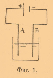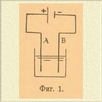 — Русский академик Якоби впервые (в 1860 г.) применил для телеграфных целей принцип вторичных батарей, т. е. батарей, которые становятся источниками Э. энергии после того, как через них пропущен ток от другого источника тока. Гастон Планте воспользовался идеей Якоби и устроил вторичный элемент, состоящий из двух свинцовых пластинок, погруженных в воду, подкисленную серной кислотой. Такой элемент при соединении обеих пластинок металлическим проводником не дает тока, но если мы соединим пластинку А (фиг. 1), например, с положительным полюсом, а пластинку В с отрицательным полюсом некоторого источника тока и если от этого последнего начнет проходить ток через пластинки и жидкость данного элемента, то, выключив после некоторого времени источник тока и замкнув обе пластинки металлическим проводником, мы заметим, что этот элемент будет давать ток тем более продолжительный, чем больше будет сопротивление проводника, соединяющего обе пластинки, и чем дольше от данного источника пропускался через элемент ток.