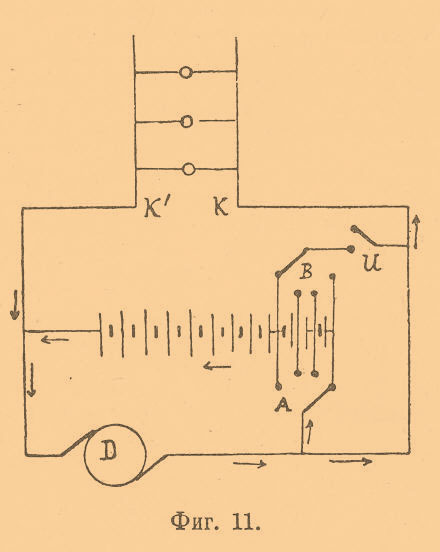 Переставляя рукоятку В, можно вводить в данную цепь АА' от 46 по 56 элементов. Для того, чтобы при передвижении ручки не было перерыва в цепи, пластинки коммутатора отделяют промежутками меньшими, чем ширина ручки В. Но в таком случае всегда будет момент, когда ручка В замкнет тот или другой элемент на короткое, например, когда рукоятка В будет лежать одновременно на двух смежных пластинках коммутатора. Для устранения такого короткого замыкания устраивают промежуточные пластинки а' b' с'... (фиг. 9), соединенные с пластинками a, b, с... сопротивлениями x.