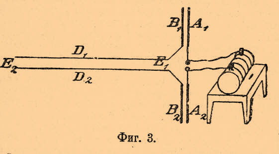 Теперь рассмотрим Э. колебания, распространяющиеся вдоль проволок. Можно устроить вибратор Герца таким образом: два металлических листа A1 и A2 соединены с искровым промежутком; перед ними поставлены два других металлических листа B1 и B2, соединенные с двумя параллельными проволоками E1 и E2 (фиг. 3).