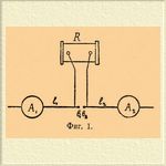 Два медных стержня l1 и l2 длиною 1,3 метра и диаметром 5 мм расположены друг против друга. На концы их надеты маленькие шарики b1 и b2, расстояние между которыми не превышало 0,75 см; на стержни надеты два шара A1 и A2 диаметром в 30 см. Искра возбуждалась между шариками b1 и b2 при посредстве большой спирали Румкорфа R. Два стержня с шарами и составляют систему вибратора. Является вопрос, не повлияет ли на период колебания вибратора то обстоятельство, что оба стержня соединены металлически через вторичную обмотку спирали Румкорфа. Можно рассуждать так. Если даже не проскочит искра, все же разность потенциалов, возникшая на шарах A1 и A2, при единичном размыкании первичной обмотки спирали должна колебательно разрядиться через вторичную обмотку спирали. Однако вследствие большого коэффициента самоиндукции вторичной обмотки колебания в ней гораздо медленнее, чем собственные колебания в системе вибратора. Поэтому вследствие большой электрической инерции вторичной обмотки собственные колебания системы вибратора вообще не передаются туда, а произойдут в прямых стержнях и искровом промежутке. Легко показать, что быстрые колебания затухают гораздо скорее, чем более медленные. После затухания быстрого колебания медленное свершится своим чередом. Пуанкаре придумал остроумное сравнения для иллюстрации вышеизложенного. Если, говорит он, к чечевице длинного и тяжелого маятника прикрепить другой, короткий и легкий, то период колебания короткого маятника очень мало пострадает от колебаний длинного маятника, на котором он висит. Кроме этих двух периодов колебаний, мы имеем еще третий периодический процесс, а именно период Нефова молотка или вообще прерывателя первичной обмотки спирали. Этот процесс намного самый медленный; ко второму удару прерывателя успеют затухнуть оба колебания, и роль прерывателя, очевидно, только та, что он вызывает периодическое повторение указанных выше колебаний и таким образом делает доступным наблюдению эти в высшей степени кратковременные процессы. Зная емкость и самоиндукцию вибратора, очевидно. можно вычислить его период колебания (см. Герца опыты). Для этого может служить формула (10). Обращаемся к резонатору. Колебания, возникающие в вибраторе и вызывающие в окружающем эфире электромагнитную волну, могут быть обнаружены на основании явления, подобного акустическому резонансу. Если поставить на некотором расстоянии два камертона, настроенные на один и тот же тон и затем привести в звучание один из них, то другой точно так же начинает звучать. Если подвесить два маятника одинаковой длины, т. е. того же периода колебания, и затем привести в колебание один из них, то и другой начнет колебаться. Эти явления, явления резонанса, охватывают собою обширный класс физических процессов и могут, между прочим, быть применены и к электрическим колебаниям. Если поместить вблизи вибратора проволочный контур определенных размеров, два конца которого сближены до весьма малого расстояния, то, вообще говоря, каждой искре вибратора будет соответствовать искра между концами проволоки рассматриваемого контура. Контуры могут быть разной формы. Они по справедливости носят название резонаторов. Один из таких резонаторов изображен на фиг. 2.