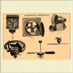 Такие типы Э. вентиляторов устанавливаются в помещениях на осветительной сети, расходуют мало энергии и представляют приборы, выкачивающие из помещений испорченный воздух через каналы в стенах или же в заделанное для этого место стекла в оконной раме. На фиг. 1 табл. показана его установка с пусковым приспособлением для мотора и скальчатой пластинчатой заслонкой для отверстия. Подобный же тип Э. вентиляторов представляет фиг. 2 табл., где изображен прибор, устанавливаемый в приспособленное отверстие в стене помещения или окна.
