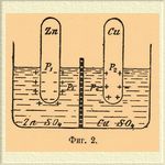 Пока цинк и медь не соединены между собой проводником, невозможен переход цинковых или медных ионов в раствор, так как возникающие заряды очень быстро воспрепятствуют этому. Однако дело изменится, если соединить медь и цинк проводником, так как тогда будут выравниваться заряды на металлах, вследствие чего один металл будет растворяться, а другой будет осаждаться. Реакция будет происходить таким образом, что металл с большей силой растворения (в данном случае Zn) будет переводить свои ионы в раствор, а металл с меньшей силой растворения (Сu) будет извлекать ионы из раствора. Однако переход ионов из цинка в раствор и выделение медных ионов из раствора на медный электрод имеет своим последствием в наружной цепи передвижение электричества от меди к цинку, т. е. возникновение Э. тока. На применениях вышеизложенных соображений к частным вопросам, на концентрационном элементе и т. д. мы не останавливаемся, отсылая читателей к ст. Электрохимия.