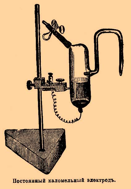 В сосуд (см. фиг.) с впаянной снизу платиновой проволокой, на дне которого находится ртуть, покрытая слоем каломели, наливается нормальный раствор хлористого калия, т. е. 74,6 г в литре раствора, или 0,1 нормальный. Электровозбудительная сила на границе этого электрода и электролита, по Оствальду, в первом случае равна 0,56 вольт, во втором 0,616 вольт. Электрод этот носит название "постоянный каломельный электрод" и применяется в электрохимии (см. статью Электрохимия).