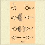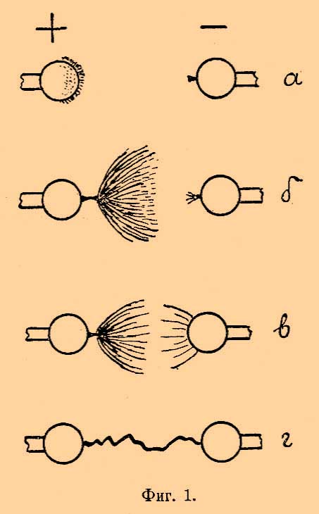 Представим себе, что в качестве проводников мы взяли два шара, наэлектризованных соответственно положительно и отрицательно (напр., при посредстве электрической машины). При достаточной разности потенциалов между шарами верхушка полож. шара (анода) покрывается тонким слоем слабого синеватого сияния (Glimmlicht), на отрицательном шаре (катоде) появляется одна или несколько маленьких световых кисточек или звездочек (фиг. 1 a). При увеличении разности потенциалов из анода выходит маленький конический красноватый световой стерженёк, внезапно переходящий на небольшом расстоянии от шарика в широкую ветвистую фиолетовую световую кисть (Bü schel); явление кисти сопровождается легким шипящим или трещащим звуком; с повышением разности потенциалов увеличивается длина ветвей кисти и повышается тон, издаваемый кистью. При этом на катоде наблюдается лишь некоторое увеличение звездочки или кисточки (фиг. 1 б). Если еще увеличить разность потенциалов или приблизить шарики друг к другу, то внезапно из катода вместо звездочки исходит более бледная кисть, направленная к кисти анода; между двумя кистями темное пространство (фиг. 1 в). Эта третья форма тихого разряда (Streifenentladung) переходит в искру (фиг. 1 г) при дальнейшем увеличении разности потенциалов или уменьшении расстояния между шариками. Разность потенциалов, при которой появляется тихий разряд и при которой одна форма его переходит в другую, в сильной мере зависит не только от расстояния между проводниками, но и от формы их и от природы газа; так при заостренных проводниках и в водороде все явления, сопровождающиеся кистью, наступают при более низких потенциалах, чем при закругленных проводниках и в воздухе. Разность потенциалов, необходимая для появления свечения на остриях, значительно меньше для катода, чем для анода, и вначале медленно, затем быстро падает с уменьшением давления. Так, по наблюдениям Тамма при давлении в 76 см ртутного столба для появления в воздухе свечения на катоде необходим потенциал его в 2140 вольт, а на аноде 3760 вольт; при давлении в 40 см необходимы потенциалы 1900 и 3350 в., при 10 см всего 910 и 1580 в. В водороде разность потенциалов, необходимая для появления свечения, меньше, в углекислоте больше, чем в воздухе; но отношение между разностями потенциалов у анода и катода для всех газов приблизительно одно и то же самое. Самый разряд представляется явлением не непрерывным, но состоящим из множества одновременно происходящих частичных прерывчатых разрядов. Потеря электричества, сопровождающаяся описанными световыми явлениями, происходит путем уноса электричества струёй воздуха — электрическим ветром — исходящим с поверхности проводников. Этот ветер, исходя с поверхности проводника, производит некоторое давление на последний (реакция струи), которое по опытам Аррениуса (1897) для анода значительно больше, чем для катода; эта реакция пропорциональна упругости газа, а для различных газов растет пропорционально корню квадратному из молекулярного веса газов. По современным представлениям, ветер состоит из струи воздуха, увлекаемой движением выбрасываемых с поверхности проводников потоков ионов (см. Электрон). Явления тихого разряда мало исследованы, значительно меньше, чем явление искры, в которое они переходят при достаточно большой разности потенциалов и достаточно малом р
