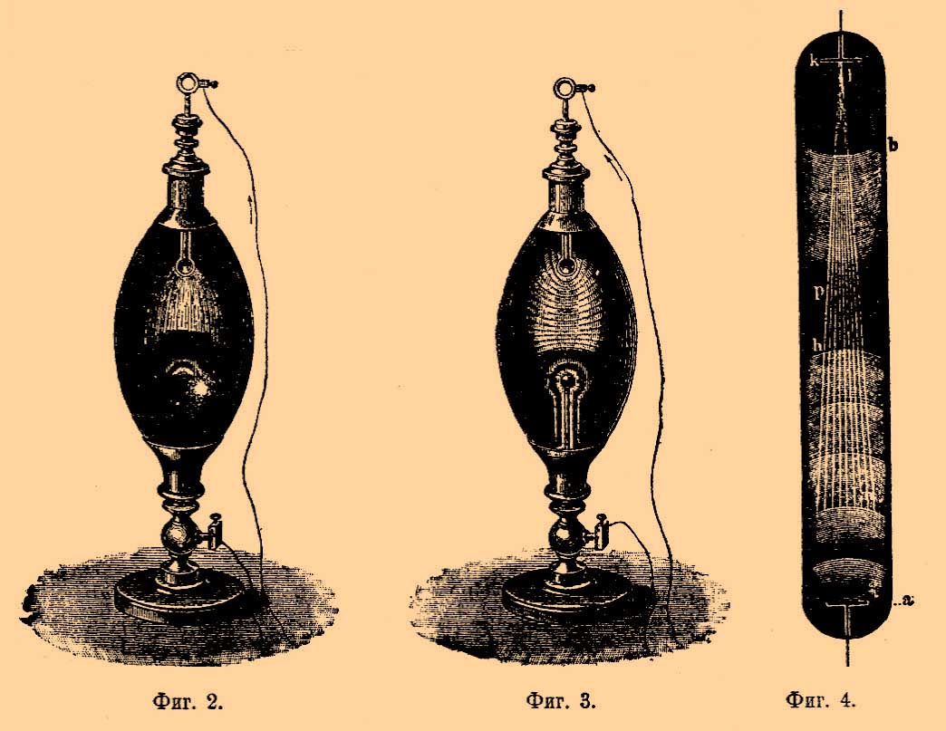 При дальнейшем разрежении свечение, окружающее катод, начинает от него отделяться и между катодом и его свечением образуется тонкий темный слой —темное катодное пространство. В то же время световой столб, исходящий из анода, но не доходящий до катода, начинает разбиваться на тонкие светлые поперечные слои — страты, разделенные более темными промежутками; это красивое явление носит название "наслоения" света или "cmpamuфикации" и начинает появляться при упругости в несколько мм ртутного столба; явление при таком разрежении изображено на фиг. 3. При дальнейшем разрежении страты делаются шире и бледнее, темное катодное пространство вырастает и катодное свечение все больше отстает от катода. В то же время из катода начинают исходить еле видные синеватые лучи, пронизывающе все внутреннее пространство трубки и ударяющие в стенки трубки, противолежащие катоду. Эти катодные лучи, появляющиеся при разрежениях довольно сильных и упругости газа ниже 0,1 мм ртутного столба, замечены были впервые Гитторфом (1869 г.), но удивительные свойства их изучены были впервые Круксом (1879 — 1880 гг.), почему вызываемые этими лучами явления часто называют явлениями Крукса. На фиг. 4 дано изображение трубки с разреженным газом в момент образования в ней катодных лучей; а — анод, k — катод, т — страты; вокруг катода катодное сияние bр, отделенное от катода темным катодным пространством, из катода исходит пучок катодных лучей l. Рассмотрим пока явления в разреженном газе при упругостях высших чем те, которые соответствуют появлению катодных лучей (Гейсслеровы трубки). Свечение газа в этих условиях есть несомненно явление люминесценции, так как непосредственные измерения температуры газа внутри сосудов показали, что температура газа никогда не превышает 100°. В неслоистом разряде (по опытам Вуда) температура анодного светового столба постоянна, затем уменьшается в темном пространстве за анодным столбом и вдоль катодного светового слоя, и затем снова быстро возрастает в темном катодном пространстве. В случае слоистого разряда температура в стратах выше, чем в темных промежутках между ними. Окраска свечения зависит от газа, наполняющего трубку. В воздухе анодный свет имеет красноватый оттенок, катодный — голубой; в водороде оба свечения красные, в углекислоте — белые. Если трубка наполнена смесью нескольких газов, то иногда замечается свечением газовой смеси внутри трубки в течение некоторого времени и по прекращении прохождения разряда; это "послесвечение" (Nachleuchten) особенно заметно в газах, к которым примешаны пары сернистой кислоты. Если мы будем питать трубку от постоянного источника тока, напр., от батареи из очень большого числа гальванических элементов, то можем убедиться, включив в цепь гальванометр, что прохождение тока через трубку с разреженным газом есть явление непрерывное. Если мы будем измерять разность потенциалов на электродах трубки и силу тока, проходящего по трубке, то убедимся, что между этими величинами нет постоянного соотношения, т. е. что прохождение электричества через разреженные газы не подчиняется закону Ома. Прохождение тока происходит так, как будто бы сопротивление газового столба не сохранялось постоянным, но уменьшалось с увеличением силы тока. Если при некоторой силе тока исследовать падение потенциала вдоль газового с