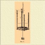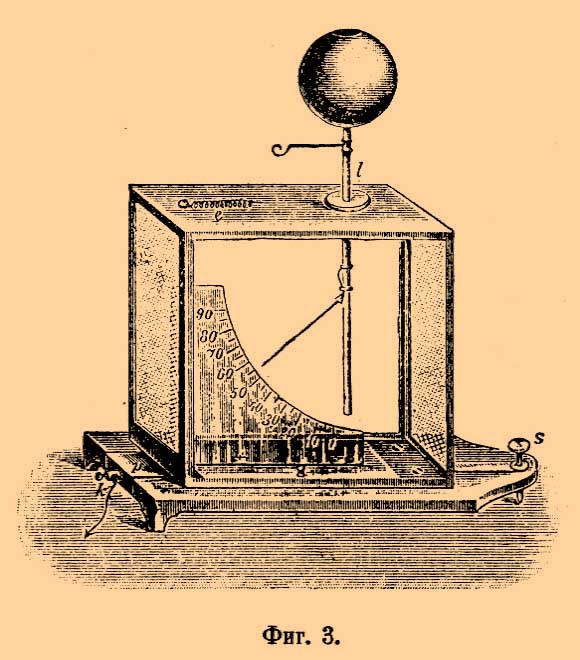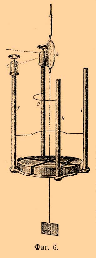 На металлической подставке (см. фиг. 5), снабженной тремя винтами, помещается стеклянная банка (из флинтгласа, хорошо изолирующего), на которой наклеены четыре широкие оловянные полоски. Эти оловянные полоски служат внешней обкладкой лейденской банки, внутреннюю обкладку которой составляет налитая в эту банку почти до половины её серная кислота (серная кислота служит вместе с тем для уничтожения влажности внутри прибора). Покрышкой для банки служит металлическая пластинка, посреди которой укреплена металлическая коробка с двумя круглыми отверстиями, закрытыми стеклами и находящимися друг к другу под прямым углом. Продолжением металлической коробки служит длинная стеклянная трубка, на верхнем конце которой устроено особое приспособление с крючком для подвешивания нити. Коконовая нить перекинута чрез крючок и к двум концам её привешено круглое зеркальце k (см. фиг. 6).