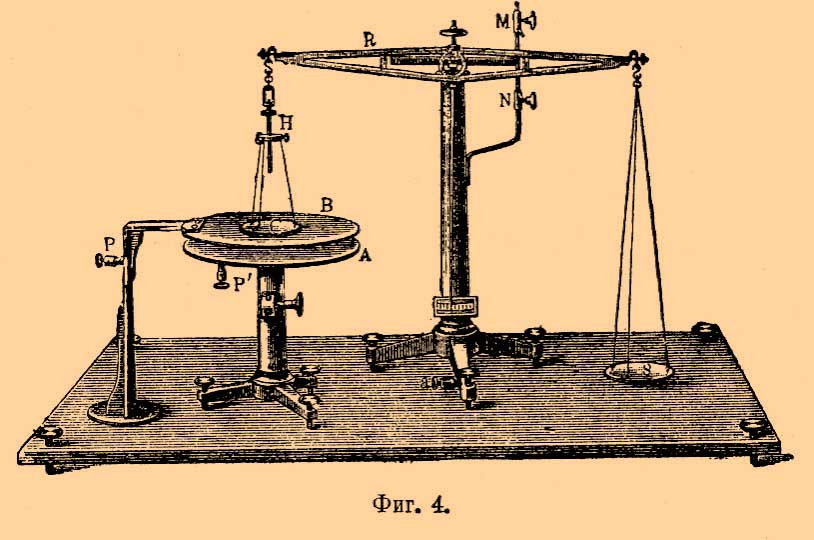 Пластинка С помещается в середине отверстия, вырезанного в металлическом диске B, имеющем одинаковую с ней толщину и радиус весьма большой в сравнении с радиусом пластинки С. Посредством особого приспособления H, устроенного на привесе, можно точно установить пластинку С в плоскости металлического диска В и поместить ее в середине этого диска, так что между диском и пластинкой будет узкая щель, а нижняя поверхность пластинки С будет совпадать с нижней поверхностью диска В. Диск В поддерживается изолированной подставкой P, которая находится в металлическом сообщении с коромыслом весов и пластинкой С, так что возможно постоянно поддерживать пластинку С и диск В при одном и том же потенциале. Диск В называется охранным кольцом и служит для установления по всей поверхности пластинки С одинаковой плотности электричества. Под диском В находится одинаковая по размерам с ним металлическая пластинка А, которая помещена параллельно ему и может посредством микрометрического винта подниматься и опускаться. Пластинка А помещена на изолирующей подставке и сообщается посредством зажима Р' с телом, потенциал которого хотят определить. Зацепы M и N предохраняют коромысло от сильных размахов.