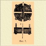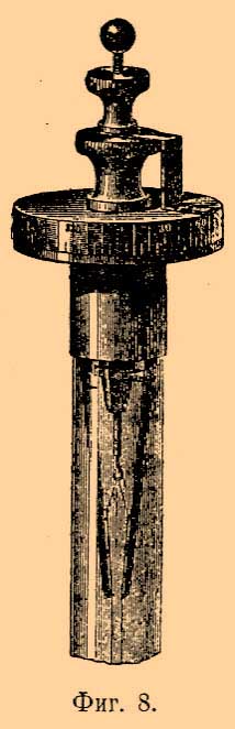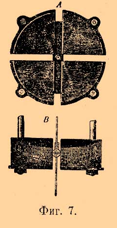 К бисквиту прикреплена платиновая проволочка, которая служит продолжением стеклянного стержня и на нижнем конце которой прикреплена платиновая пластинка, вся погруженная в серную кислоту. Бисквит помещен посреди круглой металлической коробки, разрезанной на 4 равные части (квадранты), и установлен как раз посреди одного из разрезов, разделяющих квадранты (см. фиг. 7).