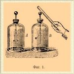 В настоящее время наиболее употребительными и удобными из приборов этого рода являются электроскопы Б. Ю. Кольбе, которые поэтому здесь и описываются. Менее чувствительный Э. Кольбе состоит из широкогорлой склянки с отрезанным дном, которое заменено металлической пластинкой с загнутыми краями (см. фиг. 1).