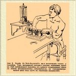 Электрические явления у человека составляют одну из самых интересных глав учения о животном электричестве. В начале XVIII столетия, в тот туманный период Э., в котором делались первые попытки применения электрической силы для теоретического объяснения жизненных явлений, мы находим уже целую группу фактов, говорящих в пользу самобытного развития электричества в живом животном организме. Наблюдаемые явления извлечения искр из электризованных людей и животных (Nollet, Gray) заставили многих ученых того времени прямо принять заряжение человеческого тела электричеством и возможность самопроизвольной электризации животных и человека как факт окончательно установленный. Du Bois-Reymond приводит один интересный случай, описанный Озерцовским (1779 г.) на основании рассказов сибиряков, заслуживавших доверия. Некий Михаил Пушкин в Тобольске (1775 г.), стоя зимой на изолирующем ковре, сообщал электрические разряды лицам, прикасавшимся к нему. С того времени и даже в самое последнее время наблюдались многие случаи существования электрогенной способности у невропатических субъектов. Как бы ни были интересны все эти факты, они не могут считаться прямо доказательными в смысле электрогенных свойств человеческого тела уже потому, что при этого рода наблюдениях не всегда исключались с точностью побочные источники для развития электричества, как напр., трение платья о кожу. Ближе к вопросу об электрогенезисе в человеческом теле подошел du Bois-Reymond, изучая прямо электрические токи мыщц при покое и во время действия у человека. Ему не удалось обнаружить у человека ток покоя в мышце при неповрежденной коже, но зато с помощью остроумно придуманного опыта он блистательно доказал развитие электрических токов в мышце под влиянием волевого сокращения мышц. Опыт этот, который изображен на фигуре 3, состоит в следующем.