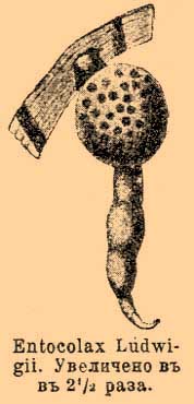 На свободном конце находится ротовое отверстие, ведущее у первого вида в выстланный мерцательным эпителием пищевод, у второго — прямо в широкий тонкостенный слепой кишечник. Далее лежит яичник, яйцевод, семяприемник и матка. Шарообразное утолщение содержит развивающиеся яйца и имеет два отверстия: боковое и конечное, лежащее на верхушке прикрепленного конца и прилегающее к тканям тела голотурия. От этого отверстия тянется канал, выстланный мерцательным эпителием и ведущий в расширенную часть тела. Близ матки лежит орган, который одними считается за почку, другими за семянники. Нервной системы, органов чувств и кровообращения не найдено. Личинки неизвестны. См. W. Volgt, "Entocolax ludwigii, ein neuer seltsamer Parasit aus einer Holothurie" ("Zeitschrift f. wiss. Zoologie", т. 47); его же, "Entocolax schiemenzii n. sp." ("Zool. Anzeiger", т. 24); Kristine Bonne vie, "Enteroxenos oestergreni" ("Zool. Jahrbücher", 1902); H. Simroth, "Mollusca" ("Bronn's Klassen und Ordnungen des Thierreichs"); Schiemenz, "Parasitische Schnecken" ("Biologisches Centralblatt", 1889).