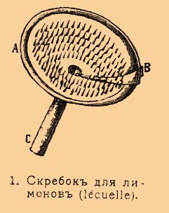 Рабочий в левую руку берет скребок, в правую — лимон или апельсин и трет его о зубцы скребка, все время поворачивая не тронутыми еще местами. Зубья скребка разрывают клетки, содержащие масло, и оно под давлением руки рабочего вытекает вместе с соком и собирается в трубке C, которую, по мере надобности, опоражнивают в какой-либо сосуд, отнимая во время переливания задвижку B. Вполне понятно, что описанными способами нет возможности вполне выделить масло; гораздо более совершенно оно отжимается механическими прессами. Прессы для этого употребляются точно такого же устройства, как и в маслобойном производстве (см.).