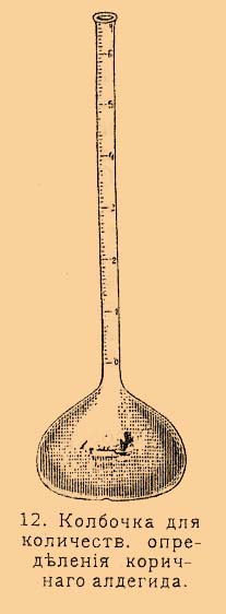 В такую колбочку помещают 10—20 куб. см исследуемого масла, равный объем уксусного ангидрида и 1—2 грамма плавленого уксуснокислого натрия. Смесь в продолжение 1—2 часов подвергается нагреванию до кипения. Затем, по охлаждении, прибавляют в колбу немного воды и снова в продолжение 1/4 — 1/2 часа нагревают, но уже на водяной бане, для полного разложения не прореагировавшего ангидрида; затем масло отделяется от водяного слоя и промывается слабым раствором соды и водой до нейтральной реакции. Промытое масло сушится плавленой глауберовой солью и около 2 грамм его обмыливается, как указано выше, при определении коэффициента омыления. По приведенному там же вычислению получается коэффициент омыления ацетилированного масла. Количество спирта, заключающегося в натуральном, не ацетилированном масле, вычисляется по формуле: ax A/(S—0,042a), где a — число куб. см нормального раствора KHO, пошедших на омыление ацетилированного масла, S — вес (в граммах) обмыливавшегося количества ацетилированного масла, а A — частичный вес определяемого спирта, деленный на десять, т. е. 15,4 для С 10 Н 18 О и 15,6 для С 10 Н 20 О. Определение в масле спирта и сложных эфиров принадлежит к наичаще теперь употребляемым методам исследования эфирных масел; не так легко определяется содержание альдегидов и кетонов. Наилучше выработан способ для коричного альдегида. Основан он на образовании этим альдегидом растворимого в воде соединения с сернистой щелочью. Производится это определение всего удобнее, как выработано в лаборатории Шиммеля, следующим образом. В колбочку формы, изображенной на фиг. 12, емкостью в 100 куб. см, с горлышком 13 см длины и 8 мм внутреннего диаметра, разделенным на десятые доли куб. см, помещают точно отмеренные 10 куб. см исследуемого масла и равный объем 30 % раствора кислого сернистокислого натрия и, после взбалтывания, нагревают на водяной бане.