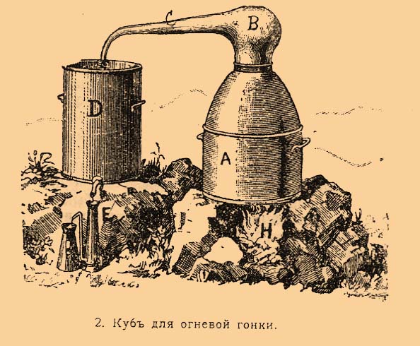 Способ получения Э. масел перегонкой основан на способности их перегоняться с водяным паром. Различают три способа получения Э. масел перегонкой: перегонку с водой, перегонку с водяным паром и перегонку с водой под уменьшенным давлением. а) При перегонке с водой материал и вода помещаются и нагреваются в одном и том же кубе. Наиболее давно употреблявшейся формой этого способа является огневая перегонка. Фиг. 2 представляет простейший прибор для такой гонки, употребляющийся и поныне на юге Франции.
