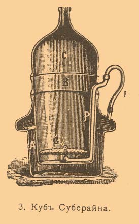 A — куб, наполненный водой и душистыми растениями, прикрытый сверху шлемом B с хоботом (отводной трубкой) C, проводящим пары из куба A в холодильник D, где они сгущаются в жидкость, стекающую в приемник E. Куб нагревается на голом огне H. Если душистые растения помещать в куб прямо на дно, то легко происходит их пригорание. Для избежания пригорания в кубе устраивают или второе сетчатое дно, препятствующее материалу для гонки опускаться на настоящее дно куба, или материал помещают в особые металлические корзины, подвешиваемые внутри куба. Однако и здесь не устраняется вполне возможность пригорания; для устранения всякой возможности пригорания заменяют нагревание на голом огне нагреванием на водяной или, чаще, паровой бане. Для этого нижнюю часть куба окружают металлической, снаружи обложенной деревом рубашкой и пропускают в нее перегретый пар. Поступают и иначе: куб снаружи окружают плохими проводниками тепла, а внутри устраивают закрытый змеевик, через который пропускают опять-таки перегретый пар. Оба способа требуют для своего применения отдельного паровика, а раз таковой имеется, то нет и причины оставаться при водном способе, а следует переходить к чисто паровому. b) При паровом способе материал сухой, смоченный или даже вместе со значительным количеством воды помещается в куб, а затем сквозь него пропускают ток пара, получаемого всего лучше в отдельном паровике. Пар при этом может быть употреблен как обыкновенный, так и под давлением (перегретый). При паровой гонке устройство аппарата должно быть таково, чтобы пар, сгустившийся до той части хобота, которая наклонена к холодильнику, никоим образом не мог попасть обратно в куб, паровой котел или другое приспособление, служащее для получения нужного для паровой гонки пара. Из аппаратов, удовлетворяющих этим условиям и в то же время не имеющих отдельного паровика, мы упомянем о кубе Субейрана в его наиболее простом виде. В самом простейшем своем виде он изображен на фиг. 3.