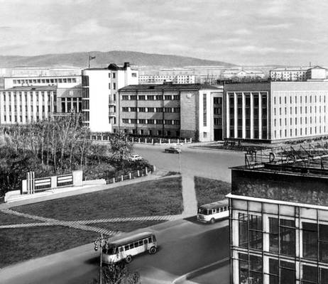 Площадь Советов в Улан-Уде. В глубине — Дом Советов (1928—31, архитектор А. А. Оль) и новое здание Совета Министров Бурятской АССР (1965—68, архитекторы А. Р. Вампилов и А. Я. Галяутдинов). Справа — кинотеатр «Прогресс» (1963—66, архитекторы А. Р. Вампилов и М. Н. Меньшиков).