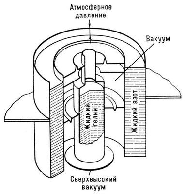Действие конденсационных, или криогенных, насосов основано на поглощении газа охлажденной до низкой температуры поверхностью (рис. 10). Водородно-конденсационный насос, предложенный Б. Г. Лазаревым с сотрудниками (Физико-технического институт АН УССР), имеет постоянную быстроту откачки в широком диапазоне давлений. Охлаждающий жидкий водород вырабатывается ожижителем, находящимся в установке. Неконденсируемые газы (водород, гелий) откачиваются параллельно включенным насосом, например диффузионным. Для включения такого насоса необходимо предварительное разрежение.