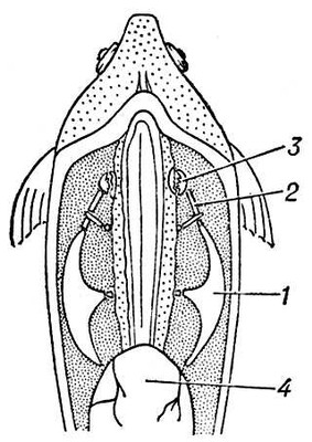 Схема строения веберова аппарата: 1 — рычаг; 2 — промежуточная кость; 3 — покрышка; 4 — плавательный пузырь.