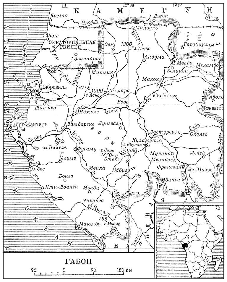 Габон (Gabon), Габонская Республика (République Gabonaise), государство в Центральной Африке. Входит во французское Сообщество. Граничит на С.-З. с Экваториальной Гвинеей, на С. с Камеруном, на С.-В., В., Ю.-В. и Ю. с Народной Республикой Конго. На З. омывается Атлантическим океаном. Площадь 267,7 тыс. км2. Население 485 тыс. чел. (1969, оценка, по данным Monthly Bulletin of statistics, March, 1971). Столица — г. Либревиль. В административном отношении разделён на 9 районов, которые делятся на округа и коммуны.