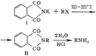 Габриеля реакция, метод синтеза первичных аминов взаимодействием органических галогенопроизводных с фталимидом калия (I) с последующим гидролизом образующегося N-замещённого фталимида (II):