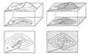 Рис. 1. Общий вид холма (а) и его изображение на топографической карте (б); общий вид холма и образующих его слоёв песчаника и известняка (в); изображение их на геологической карте (г).