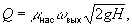 где wвых — площадь выходного сечения насадка, Н — напор, который обусловливает течение жидкости, mнас — коэффициент расхода, определяемый опытным путём и зависящий от конструкции насадка, напора, а также от физических свойств жидкости.