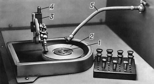 Рис. 2а. Гранильный станок для огранки алмазов в бриллианты (1 — шпиндель станка; 2 — чугунная планшайба; 3 — квадрант с делительной головкой; 4 — направляющая со стойкой; 5 — цанговые зажимы, оправки для обрабатываемого изделия).