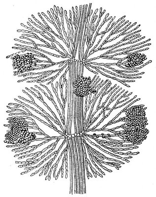 Батрахоспермум: часть таллома, группы карпоспор образуют т. н. цистокарпии.