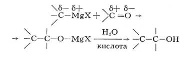 При взаимодействии RMgX с CO2 образуются карбоновые кислоты, с формальдегидом (CH2 = O) — первичные спирты, с прочими альдегидами (RCH = O) — вторичные, а с кетонами (RR'C = O) — третичные спирты. Применение Г. р. для получения кетонов из карбоновых кислот и их производных, например: