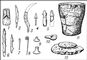 Дьяковская культура. Предметы из древнейших городищ. Железные изделия: 1 — топор; 2 — нож; 3 — серп; 4 — наконечник стрелы. Изделия из кости: 5 — рукоятки ножей; 6 — гарпуны; 7 — булавка; 8 — бронзовая булавка. Изделия из глины: 9 — грузики; 10 — льячек; 11 — сосуд с «сетчатым», или «текстильным», орнаментом; 12 — каменная ручка зернотёрка.