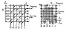 Переключательные матрицы (слева — диодная; справа — на ферритовых сердечниках): R — резисторы; Еа — источник питания; Д — диоды; Ф — ферритовые сердечники (кольца); Icч — ток считывания; Iзп — ток записи; а, b, с — входные величины.