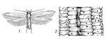 Амбарная зерновая моль: 1 — бабочка; 2 — часть початка кукурузы с бабочками и выходными отверстиями в зёрнах.