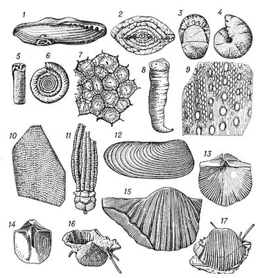 Рис. 2. Фауна каменноугольного периода. Фораминиферы: 1 — фузулина (Fusulina) — внешняя форма раковины, ´ 30; 2 — тритицит (Triticites) — поперечный срез, ´ 15. Головоногие моллюски — аммониты: 3, 4 — маратонит (Marathonites); 5, 6 — эоазианит (Eoasianites). Кораллы: 7 — колониальный коралл литостротионелла (Lithostrotionella) — поперечный срез; 8 — одиночный коралл амплексус (Amplexus). Мшанки: 9 — полипора — боковое сечение, ´ 11; 10 — полипора — внешний вид. 11 — Морская лилия кромиокринус (Cromyocrinus). 12 — Пластинчатожаберный моллюск аллорисма (Allorisma). Плеченогие моллюски — брахиоподы; 13 — хористит (Choristites mosquenesis); 14 — хористит — внутреннее строение створки; 15 — продуктус (Gigantoproductus); 16, 17 — продуктус (Antiquatonia) — видны иглы, которыми раковина прикрепляется к морскому дну.