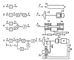 Рис. Структурные схемы датчиков (слева — блок-схема, справа — примеры выполнения): а — простейший вид датчика (термопара); б — каскадное соединение преобразователей; в — дифференциальный датчик; г — компенсационный датчик; 1 — воспринимающий орган датчика (чувствительный элемент); 1а — термопара; 1б и 1г — мембраны; 1в — соленоидный индуктивный датчик; 2 — выходной орган датчика; 2б — индуктивный датчик; 3 — измеритель рассогласования (вычитающий элемент); 3г — индуктивный датчик; 4 — усилитель; 5 — генератор компенсирующей величины; 5г — магнитоэлектрическая система; 6 — промежуточный орган датчика; R — электрическое сопротивление; L — индуктивность; е — электродвижущая сила; I — электрический ток; p — давление.