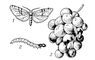 Двулётная листовёртка: 1 — бабочка; 2 — гусеница; 3 — поврежденная гроздь винограда.