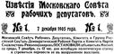 Первый номер газеты «Известия» от 7 декабря 1905 с текстом манифеста Московского совета рабочих депутатов «Ко всем рабочим, солдатам и гражданам».
