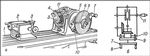 При настройке Д. г. для нарезания (фрезерования) винтовых канавок (рис. 3) обеспечивают кинематическую связь вращения изделия с его поступательным (от винта продольной подачи стола) перемещением через сменные зубчатые колёса; рукоятка и лимб соединены фиксатором. Стол станка поворачивают на угол, равный углу наклона винтовой канавки w; ось шпинделя станка (ось фрезы) составляет с осью изделия угол Q = 90° — w,