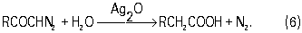 Без выделения азота Д. взаимодействует, например, с галогенангидридами карбоновых кислот с образованием диазокетонов. При разложении последних в присутствии воды, спиртов или аминов и катализатора (Ag2O) происходит перегруппировка с образованием кислоты (её эфира или амида) с числом атомов углерода, на единицу большим, чем в исходном хлорангидриде (реакция Арндта — Эйстерта):
