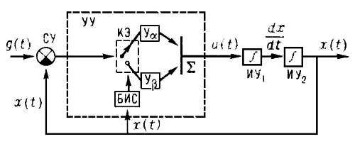 Рис. 1. Функциональная схема системы управления с переменной структурой: УУ — устройство управления; СУ — сравнивающее устройство; КЭ — ключевой элемент; БИС — блок изменения структуры; ∑ — сумматор; Уa — усилитель с коэффициентом передачи a; Уb — усилитель с коэффициентом передачи b; ИУ — интегрирующие устройства; g(t) — задающее воздействие; u(t) — управляющее воздействие; x(t) — управляемая величина.