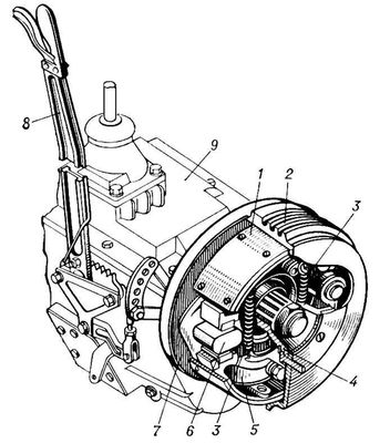 Рис. 2. Трансмиссионный тормоз автомобиля: 1 — тормозная накладка; 2 — тормозной барабан; 3 — стяжная пружина; 4 — фланец вторичного вала коробки передач; 5 — колодка; 6 — разжимной кулак; 7 — тормозной щит; 8 — рычаг привода ручного тормоза; 9 — коробка передач.