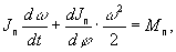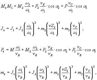 где Мп — приведённый момент; Jп — приведённый момент инерции; Рп — приведённая сила; mп — приведённая масса; M1, M2, P2, P3 — моменты и силы, приложенные к звеньям механизма; w1, w2 — угловые скорости звеньев; uB, uC — скорости точек В и С механизма; uS2 — скорость центра тяжести звена 2; uK — скорость точки К приложения силы P2; a2 — угол между векторами P2 и uK; a3 — угол между векторами P3 и uC. Уравнение движения для данного случая: