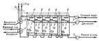 Рис. 3. Схема многоступенчатого дистилляционного опреснителя с мгновенным вскипанием: I, II, III, IV и N — камеры испарения; 1 — насос; 2 — паровой эжектор; 3 — конденсатор эжектора; 4 — подогреватель; 5 — брызгоулавливатель; 6 — конденсатор; 7 — поддон для сбора конденсата.