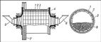 Схема барабанно-шаровой мельницы: 1 — барабан; 2 — броневые плиты; 3 — изоляция (от шума и тепловая); 4 — торцовый фланец мельницы; 5 — входной патрубок; 6 — выходной патрубок; 7 — ведомая шестерня; 8 — шары.
