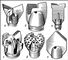 Рис. 3. Лопастные долота; а — трёхлопастное; б — двухлопастное; в — типа «РХ»; г — истирающе-режущие типа «ИР»; д — фрезерное типа «ФР»; е — пикообразное.