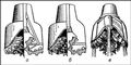 Эффективное бурение скважин обеспечивается своевременной очисткой забоя от выбуренных частиц породы и подъёмом их на поверхность, а также охлаждением рабочих элементов Д. б. Это осуществляется обычно продувкой (рис. 4, а) при бурении неглубоких (до 20 м) скважин, а при бурении глубоких и сверхглубоких — промывкой. В шарошечных Д. б. применяется два вида промывки: по центральному каналу (рис. 4, б) и гидромониторная — между шарошками (рис. 4, в), а в больших корпусных Д. б. — их комбинация. Форма, сечение, расположение и количество промывочных каналов зависят от назначения, типа и размера Д. б. В гидромониторных шарошечных и лопастных Д. б. для увеличения передаваемой ими гидравлической мощности применяются сменные минералокерамические или металлокерамические насадки различных диаметров, преобразующие перепад давлений на Д. б. в скоростной напор, повышающий эффективность разрушения породы.