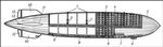 Рис. 3. Схема дирижабля жесткой системы: 1 — газовые шахты для отвода газа, выпускаемого через газовые клапаны 2, в атмосферу; 2 — газовые клапаны; 3 — шпангоуты; 4 — стрингеры; 5 — наружная оболочка; 6 — главная гондола управления; 7 — пассажирские палубы; 8 — помещение команды; 9 — место расположения боковой моторной гондолы; 10 — верхний и нижний стабилизаторы; 11 — боковой стабилизатор; 12 — рули направления; 13 — рули высоты.