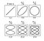 Вид фигур Лиссажу при различных соотношениях периодов (1:1, 1:2, и т. д.) и разностях фаз.